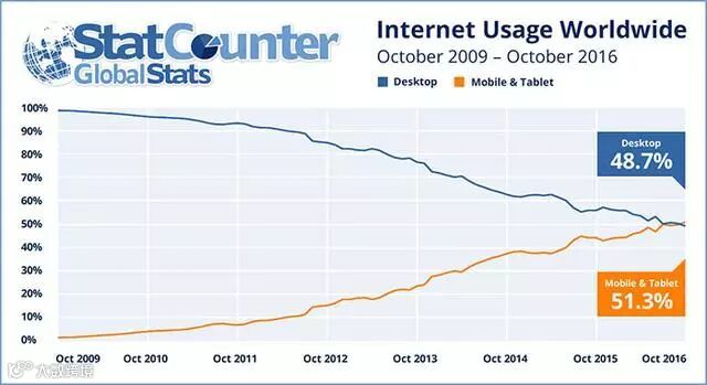 早在 2015 年 5 月,Google 搜索业务就已经出现移动搜索次数超过 PC 搜索次数的情况。而根据科技市场研究公司 StatCounter 的报告,今年十月移动版网站(主要面向手机和平板专门设计)的访问流量已经超过了传统网站。