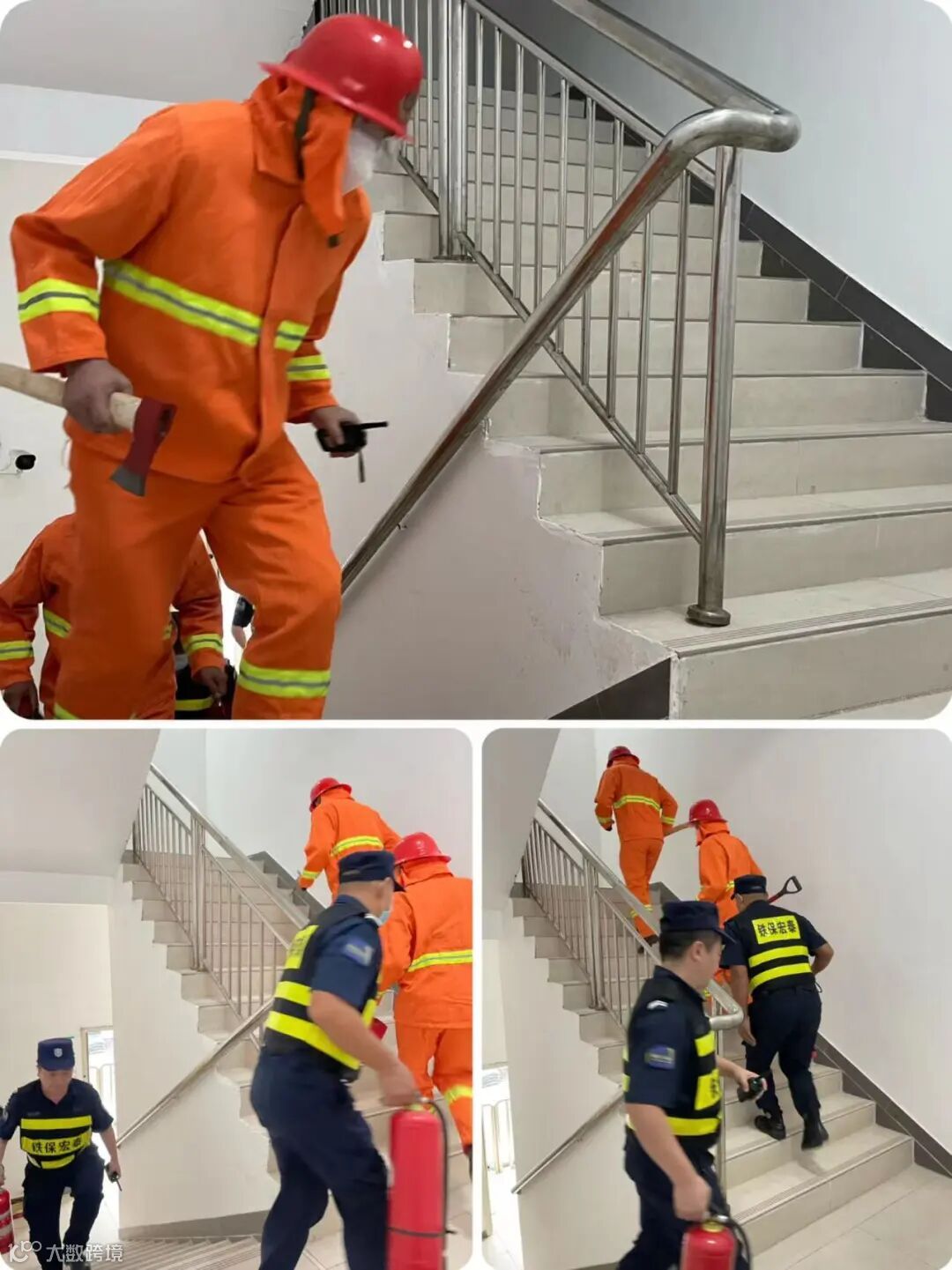 此次演习,模拟大厦五楼因电线短路突发“火灾”,消防监控中心接到报警立即通知巡逻安管员到场确认。确认火情火势后,总指挥立即组织协调指挥火灾救援;