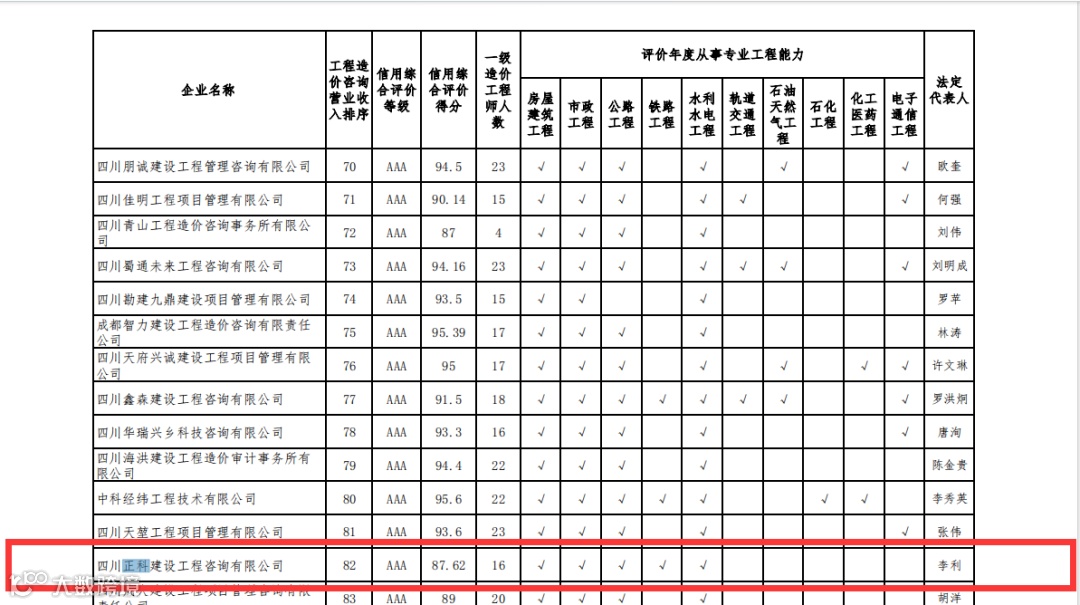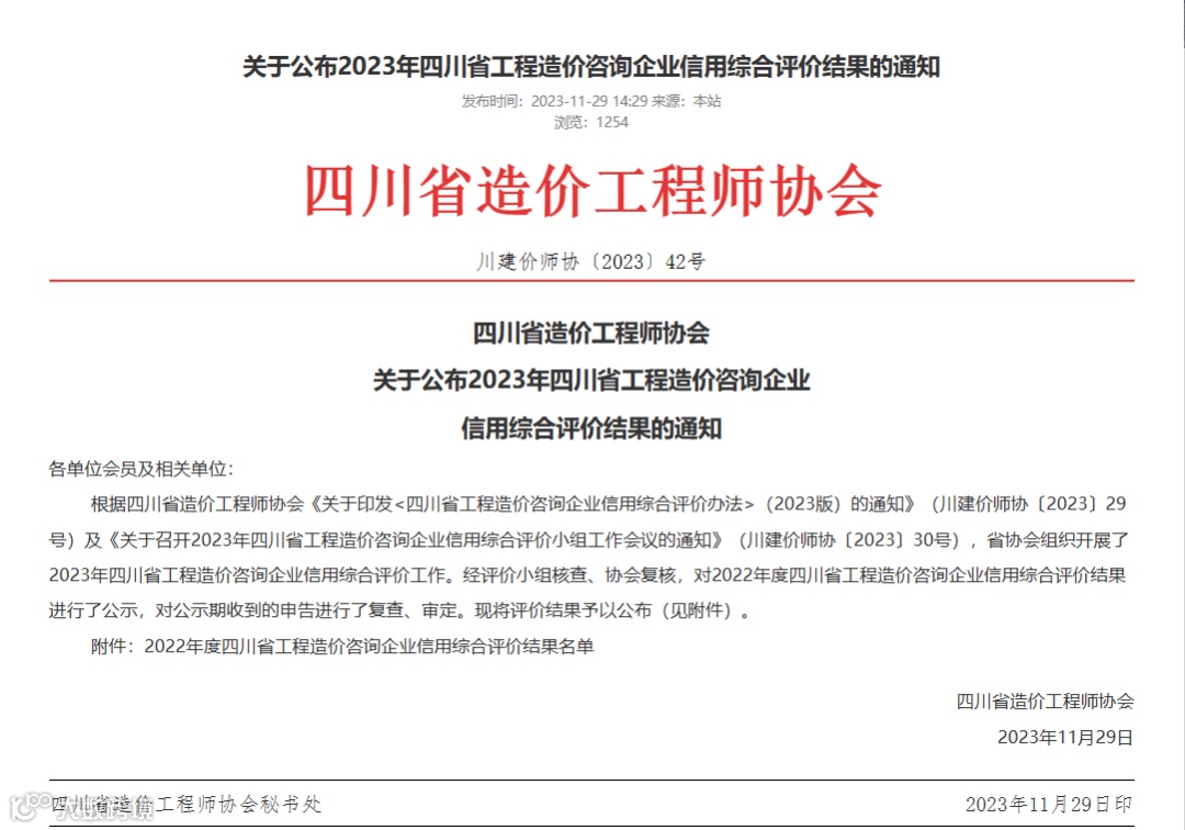 近日,四川省造价工程师协会公布了《2023年四川省工程造价咨询企业信用评价结果的通知》,经单位申报、评价小组核查、协会复核,公示期复查,审定等程序,四川正科建设工程咨询有限公司荣获2022年度四川省工程造价咨询企业信用评价3A!