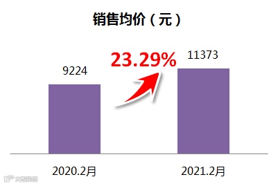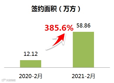 2021年2月,公司实现签约面积58.86万平方米,同比增长385.64%;签约金额66.94亿元,同比增长498.75%,签约均价11373元/平方米。