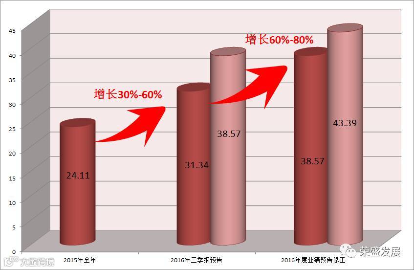 荣盛发展发布2016年度业绩预告修正公告:修正公司于2016年10月27日披露的《公司2016年第三季度报告正文》《公司2016年第三季度报告全文》中公布的业绩预告,将2016年度归属于上市公司股东的净利润增幅由30%-60%提升为60%-80%,即净利润变动区间由31.34亿元-38.57亿元调升为38.57亿元-43.39亿元。