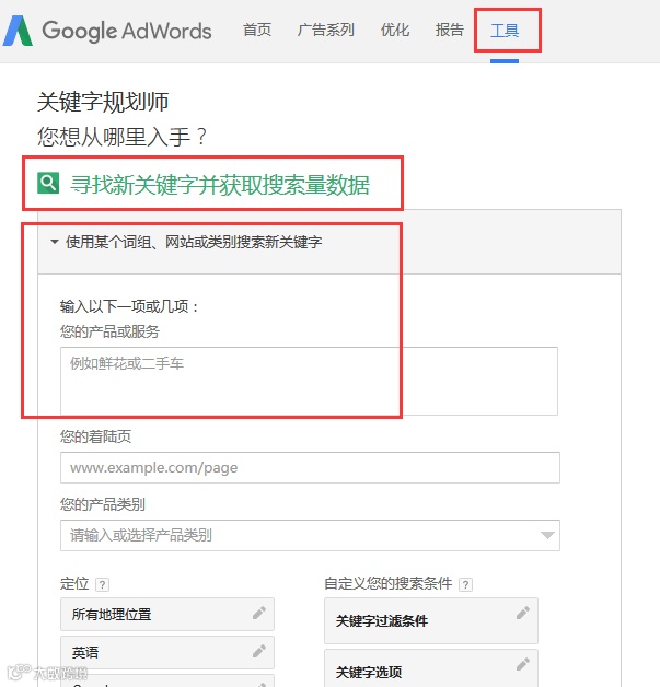 注册完成之后进入到google adwords 的“工具”里面,选择“关键字规划师”,然后选择“寻找新关键词并获取搜索量数据“——“使用某个词组、网站或类别搜索新关键词”。