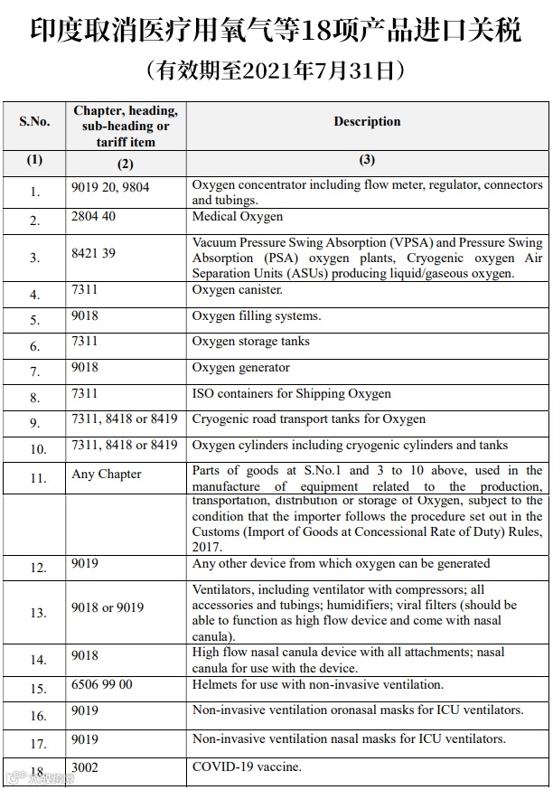 由于当前印度疫情大暴发,氧气瓶、制氧机市场上已供不应求,印度财政部已于4月24日发布第28/2021-Customs公告,取消医疗用氧气(Medical Oxygen , HS 280440) 、储存瓶、造氧机(Oxygen Generator,HS 9018) 、呼吸器(Ventilator , HS 9018/9019) 、氧气面罩等18项产品进口关税,至2021年7月31日止。