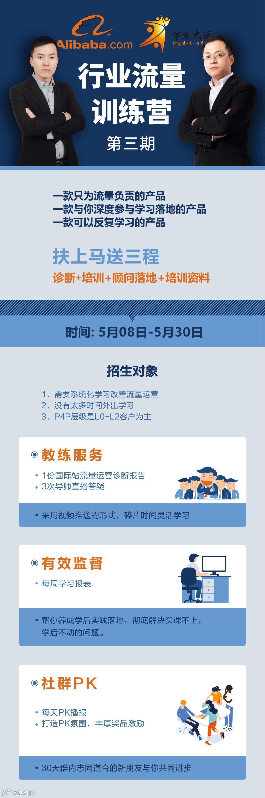 行业流量训练营是一款只为流量负责的产品,一款与你深度参与学习落地的产品,一款可以反复学习的产品,扶上马送三程!课程采用远程诊断+视频推送培训+直播答疑+顾问落地+培训资料的形式进行,每次课程先会进行视频推送,学员可以灵活利用碎片化的时间学习,再通过直播的形式对学习中遇到的问题进行在线答疑。欢迎报名学习,共同进步。