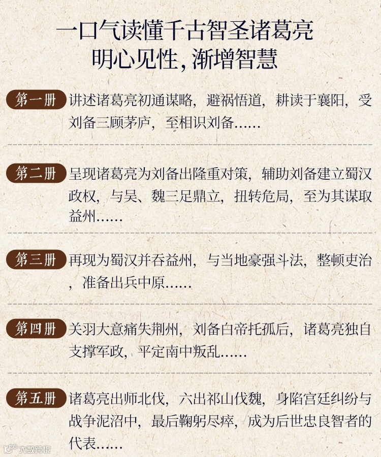 全套书共分为五,横跨诸葛亮54年的人生。一套书全家都适合读,值得一生收藏。