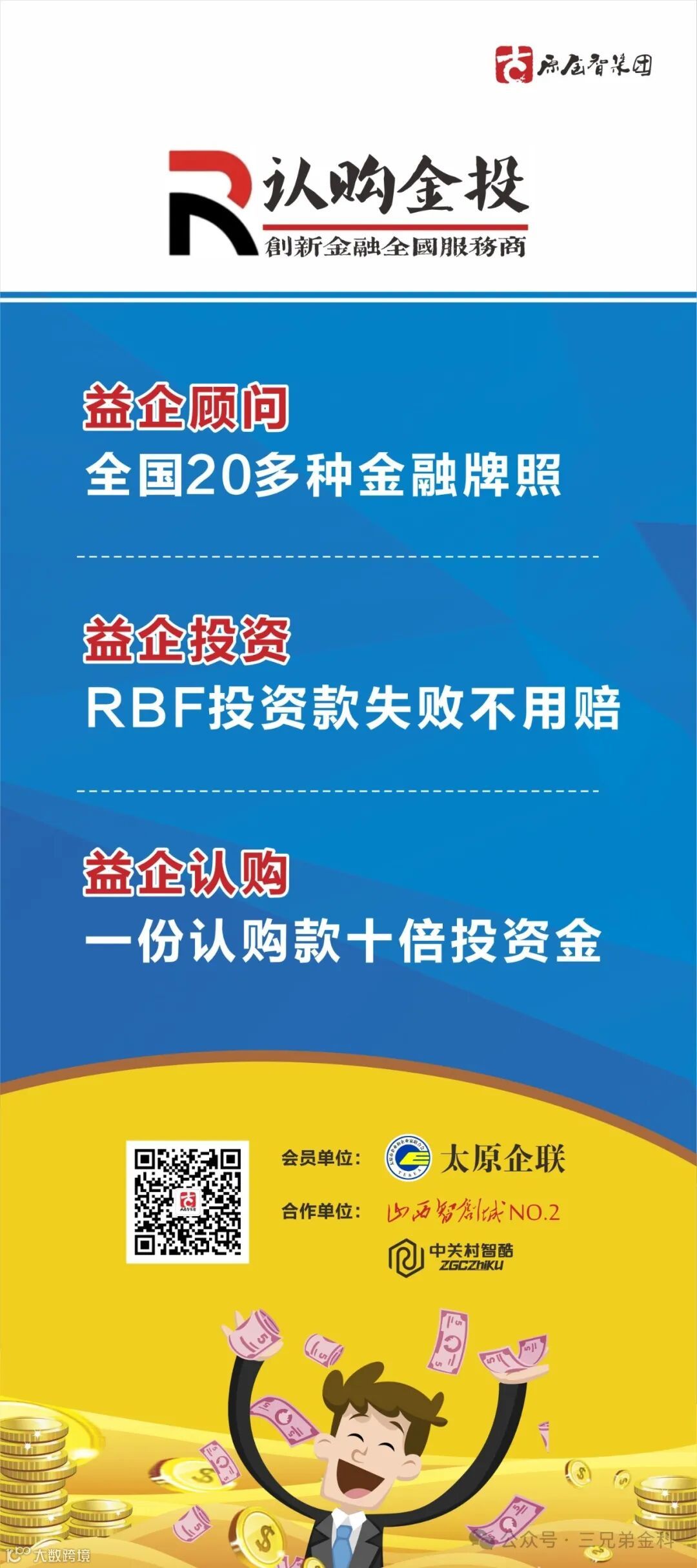 原金智集团:创新金融“认购金投”是促进科技成果转化的全国服务商。以创新的方式重新定义了资金募集“益企认购”,重新定义了投资方式“益企投资”,重新定义了风控模型“益企顾问”,从而从根本上重新定义了收益获取与退出机制。