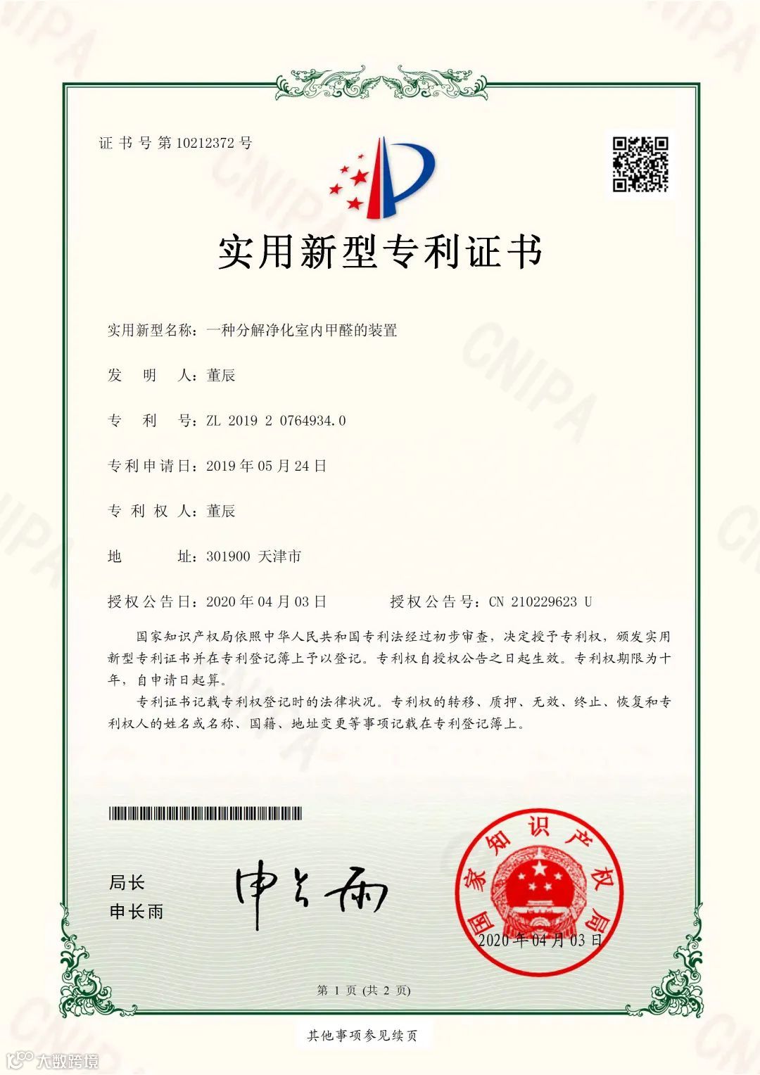24小时除醛率高达95.9%