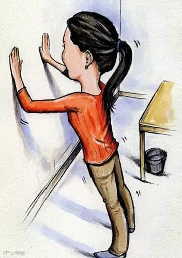 面对墙壁,靠近站立,双脚打开与胯部同宽;双臂前伸,与肩膀同高,宽度略大于双肩,两手撑住墙面;稍微后退两小步,收紧腹部肌肉,肘部慢慢弯曲,后背和颈部保持挺直(如图5),双眼平视墙壁;然后身体稍微降低一些,再撑起身体,回到起始姿势;做3组动作,每组10次。(来源:生命时报)
