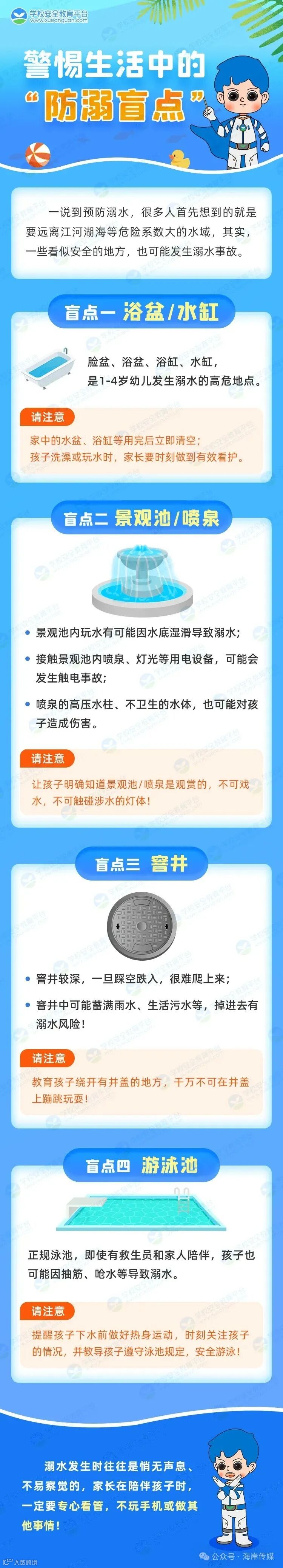 防溺水是全年都要注意的事,我们既要防止在河流、湖泊溺水,也要防止容易忽略的盲点。