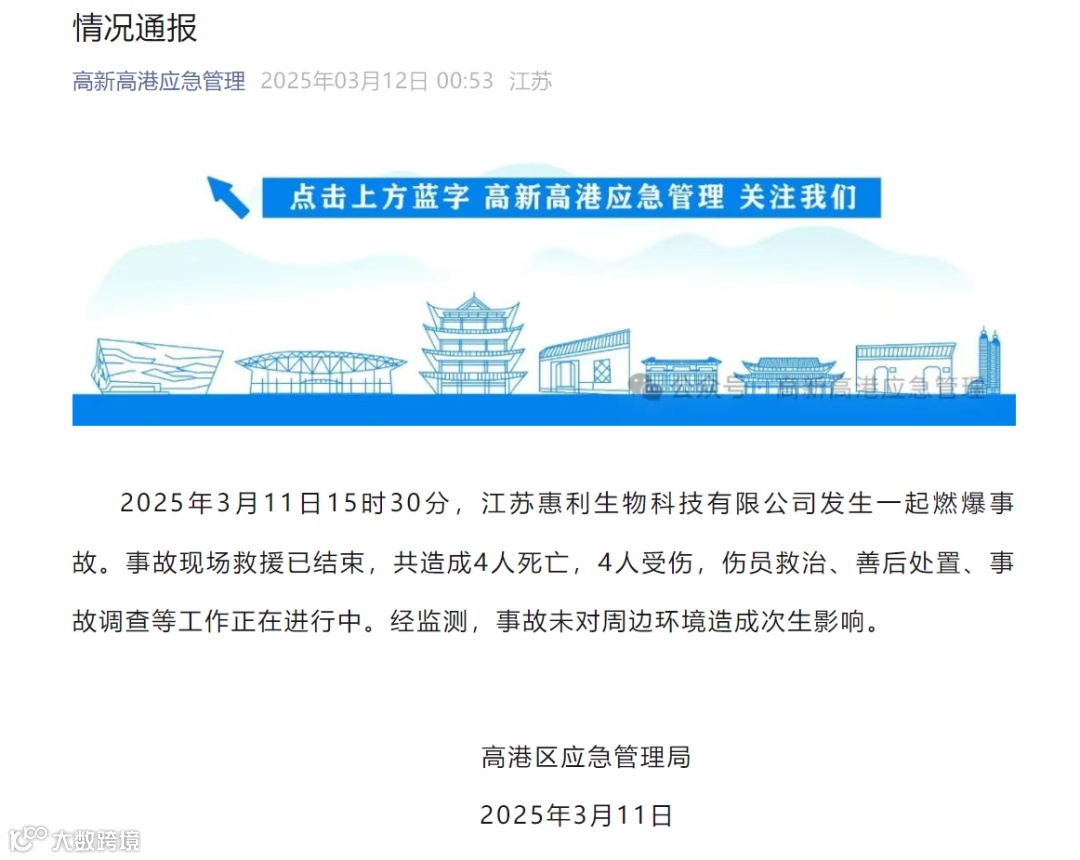 市高港区应急管理局通报,3月11日15时30分,江苏惠利生物科技有限公司发生一起燃爆事故。事故现场救援已结束,共造成4人死亡,4人受伤,伤员救治、善后处置、事故调查等工作正在进行中。经监测,事故未对周边环境造成次生影响。