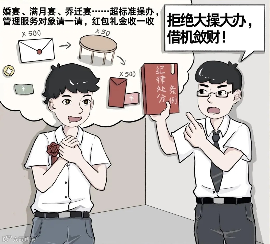 利用职权或者职务上的影响操办婚丧喜庆事宜,造成不良影响的,给予警告或者严重警告处分;情节严重的,给予撤销党内职务处分;借机敛财或者有其他侵犯国家、集体和人民利益行为的,从重或者加重处分,直至开除党籍。