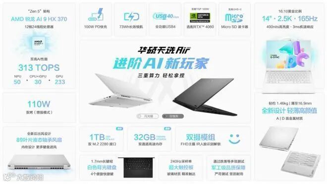 配置方面,天选Air 2024至高搭载全新AMD 锐龙AI 9 HX 370处理器,其基于“Zen 5”架构打造,最大时钟加速频率可达5.1GHz,具备超强性能与能效表现,NPU算力高达50 TOPS,可实现Windows系统级AI功能。图形性能上,拥有100W的专为AI时代打造的NVIDIA GeForce RTX 4060笔记本电脑GPU加持。