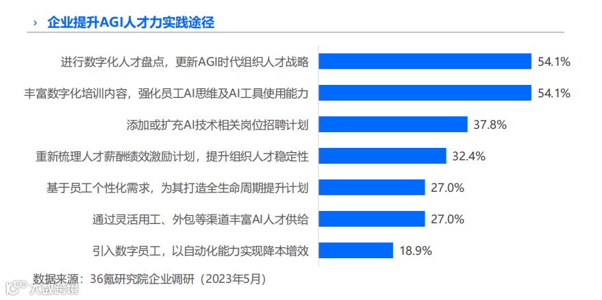 《AGI时代下的组织变革研究报告》中显示,就人才力打造而言,半数以上的受访企业希望通过数字化人才盘点明确AGI时代组织人才战略。数字化人才盘点是了解组织现有人才结构和能力的关键步骤,组织可以基于对现有员工数字化技能的调查和评估,判断员工是否具备适应AGI时代新技术和人工协作模式的能力,明确组织人才的分布情况、潜力和发展需求,由此洞察组织能力和人才缺口。