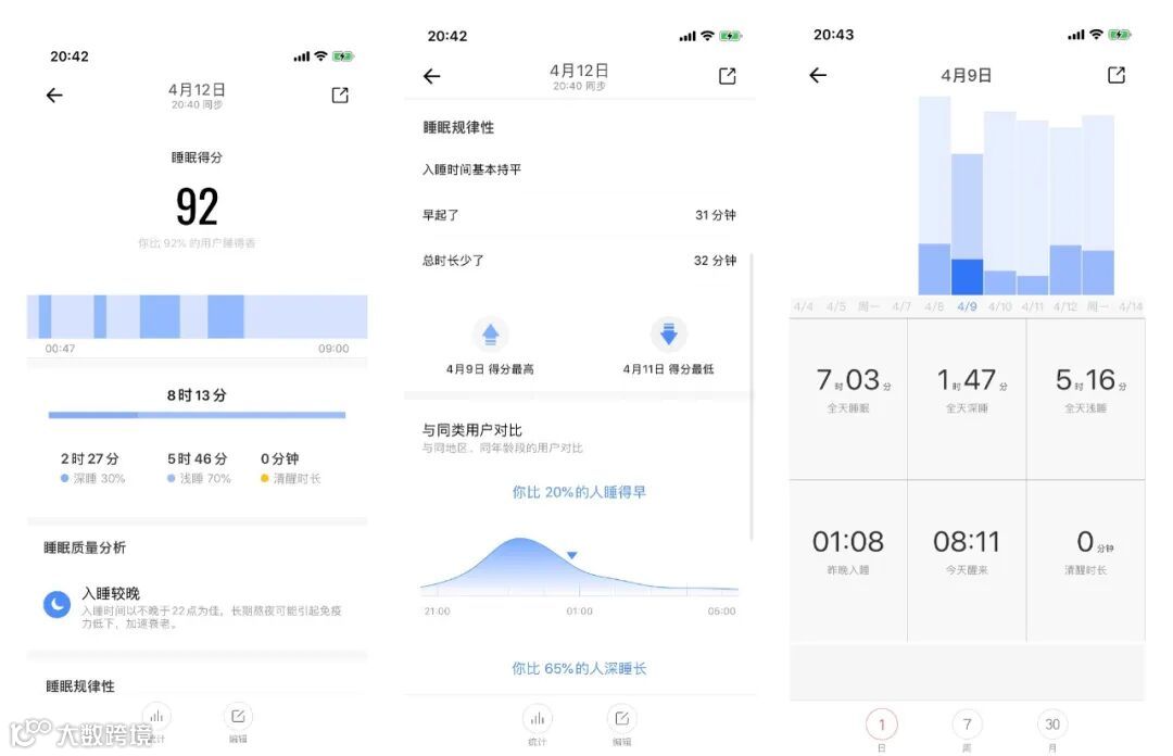 睡眠质量监测方面,Amazfit APP内给出了详细的数据,清晰展示了深睡、浅睡、清醒的时长,并给出睡眠质量分析。同类用户对比功能,直接将用户数据与同地区、同年龄段的用户进行对比,更有助于发现自身在睡眠质量上的不足。看起来范儿除了疯狂熬夜,睡眠质量还是杠杠滴~