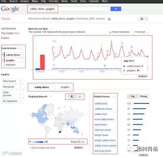 可以看到,护目镜(goggles) 的搜索总量明显高于安全鞋 (safety shoes) ,而且需求有规律地起伏。每年都是在December (十二月,冬季,中国的春季前) 达到搜索量高峰。