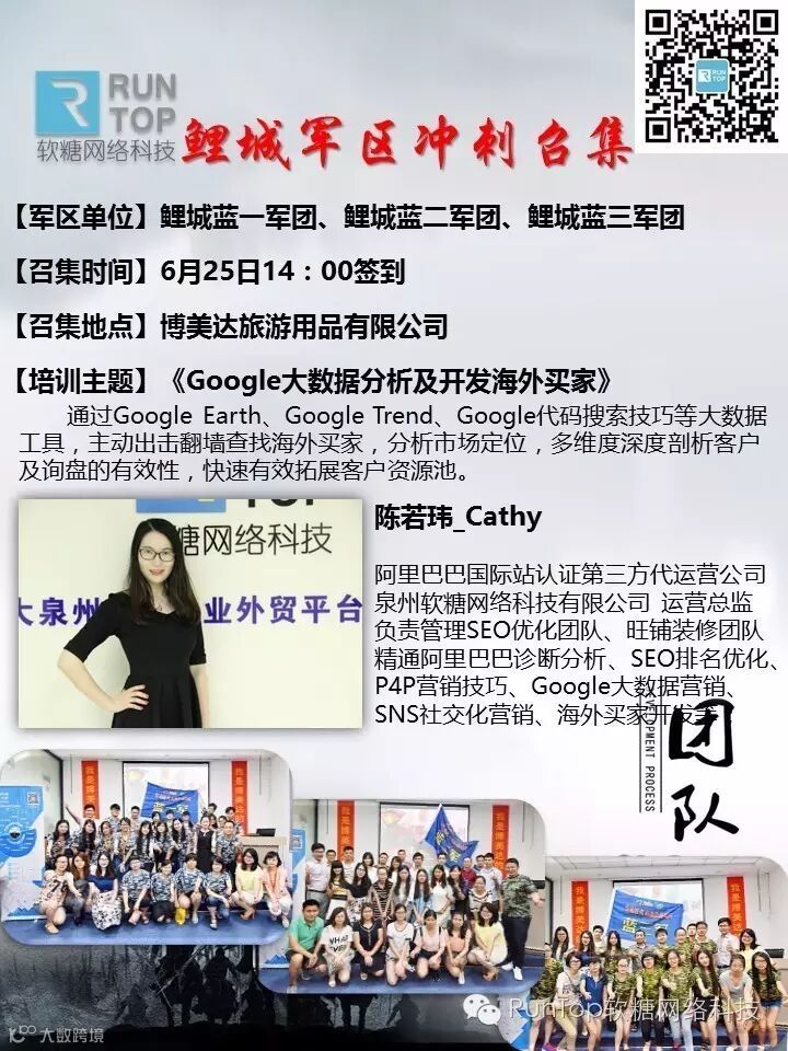 最后是大家期待已久的主题培训——《Google大数据分析及开发海外买家》,由来自软糖网络科技的运营总监——陈若玮_Cathy为大家分享如何通过Google Earth、Google Trend、Google代码搜索技巧等大数据工具,主动出击翻墙查找海外买家,分析市场定位,多维度深度剖析客户及询盘的有效性,快速有效拓展客户资源池!