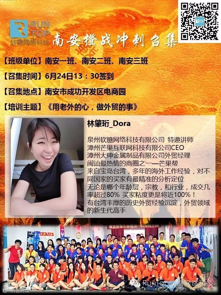 本次南安信保生态橙战【RunTop网络科技】不仅担当了三大班级的班主任角色,同时在以学习委员的身份邀请到了人气嘉宾为南安的战士们分享《用老外的心,做外贸的事》,她是来自宝岛台湾的新生代外贸高手,拥有多年的海外工作经验,对不同国家的买家有最精准的分析定位,无论是哪个年龄层,宗教,和行业,本次到来为大家解密如何能够做到成交几率超过80%!买家粘度将近100%!她就是「漳州芒果互联网科技有限公司」CEO、「漳州大珅金属制品有限公司」外贸经理——林肇珩_Dora!