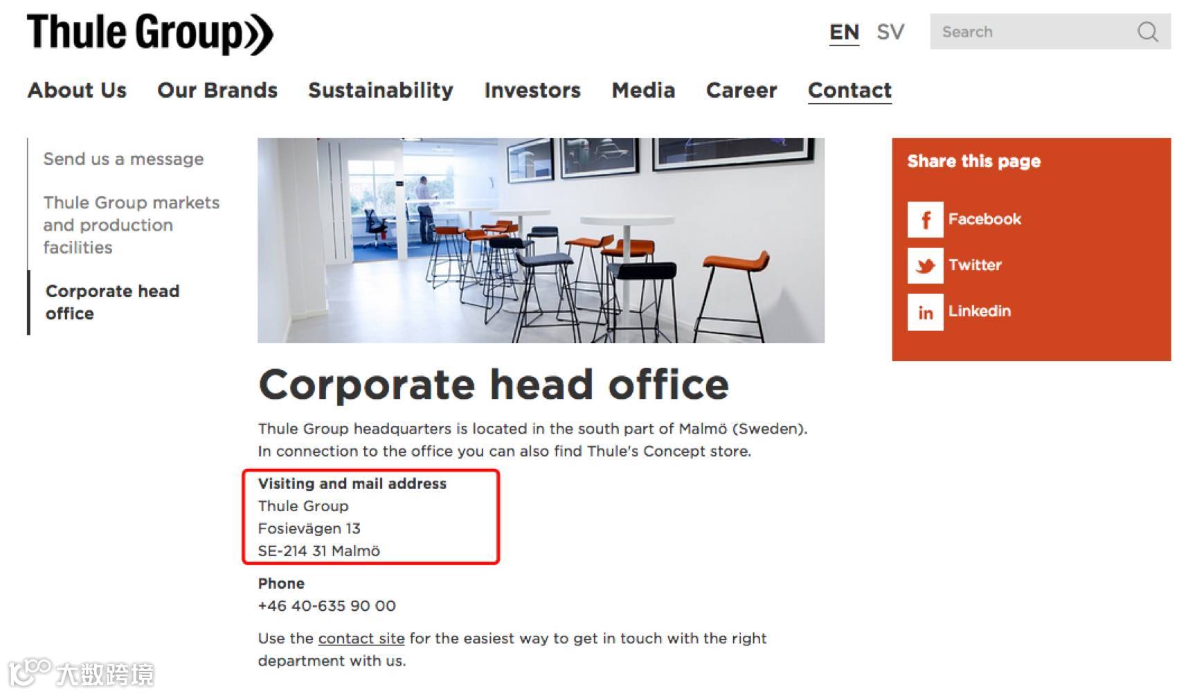 通过名片或者官网找到该买家的公司地址是:Thule Group,Fosievägen 13 ,SE-214 31 Malmö
