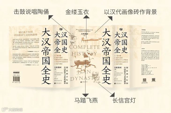 护封以汉代著名文物为灵感,以汉代画像砖为背景,击鼓说唱陶俑、金缕玉衣、马踏飞燕、长信宫灯……都是镇馆之宝,跃然纸上彰显大汉豪迈气概!