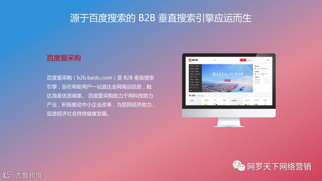 百度爱采购(b2b.baidu.com)是百度旗下的 B2B 垂直搜索引擎,旨在帮助用户更好地解决企业发展难题。平台背靠百度强大的搜索技术,服务海量用户,并利用AI技术,完美匹配需求线索,精准触达买卖双方,助力产业发展,积极推动中小企业改革,促进经济社会持续健康发展;
