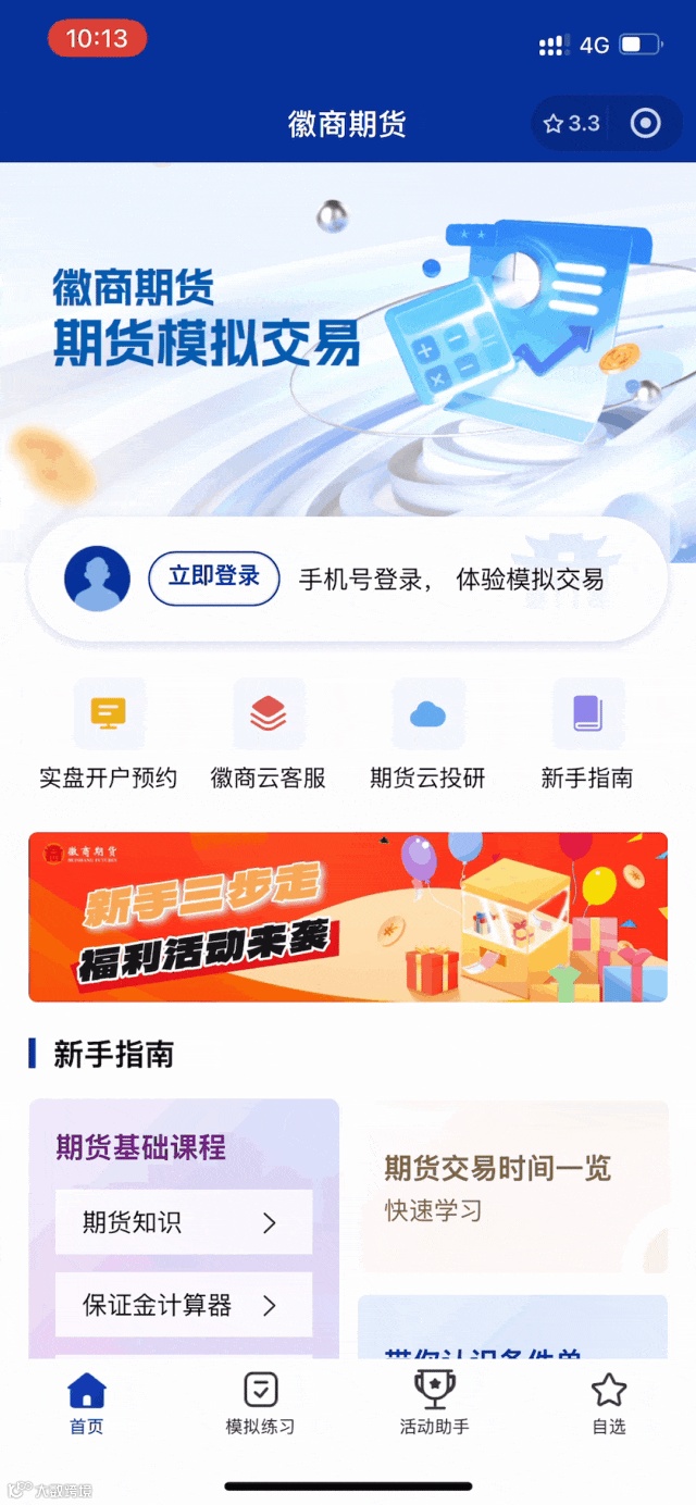 进入“徽商期货模拟交易”小程序,在首页找到“立即登录”,如首次登录则需要进行注册,如已注册,则只需要手机号和验证码登录即可。