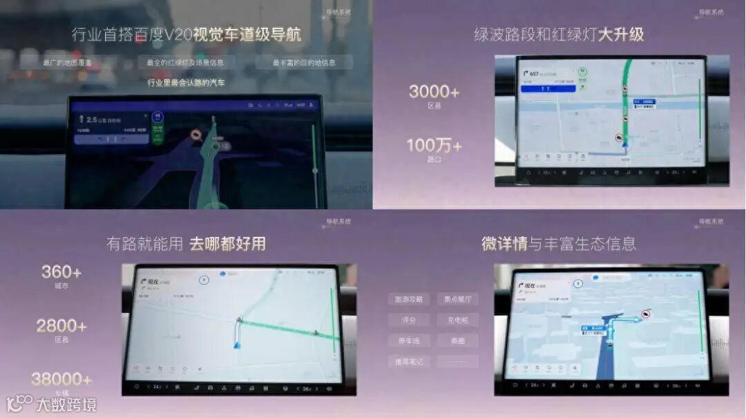 “双覆盖能力”,导航范围覆盖全国360个城市、2800区县、38000乡镇,红绿灯展示覆盖全国近3000区县、100多万路口,连乡镇小路都能精准定位,偏航0.5秒即刻提醒,堪称“强迫症患者的福音”。绿波路段信息更优,通行效率位列第一梯队,一路绿灯畅行,效率堪比科幻电影里的AI交通管制,比如赶飞机、赶高铁时,用户不会再因一路红灯而焦躁,绿波车道功能能让用户一路绿灯、一路顺心。自动推送目的地及周边信息,信息丰富度行业第一,导航至充电站时,支持搜索750V以上超充,地点信息包含闲忙桩数量、充电价格、电压、停车费等;导航至餐馆,支持展示菜系、评分,以及附近部分停车场的车位、价格等等。