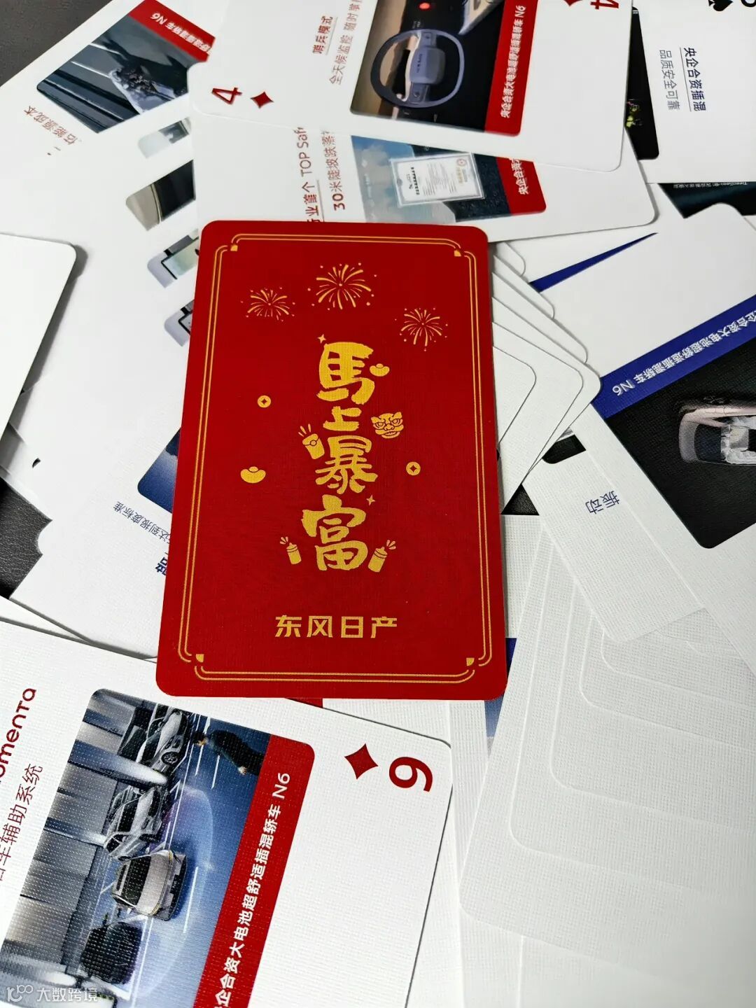 这副牌可不是普通的牌,它简直就是日产N6的“说明书”!每张牌上都印着N6的硬核优点,两张王牌写的是“颜值”和“舒适”,这我完全同意,范儿试驾过实车是真的好看又好坐。