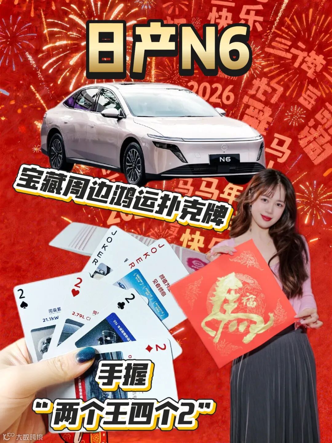 快来看我收到了什么宝藏礼物,东风日产N6的鸿运扑克牌!这包装就红红火火的,拆开一看,哇,直接就是王炸配置:大小王加四个2,排面拉满!