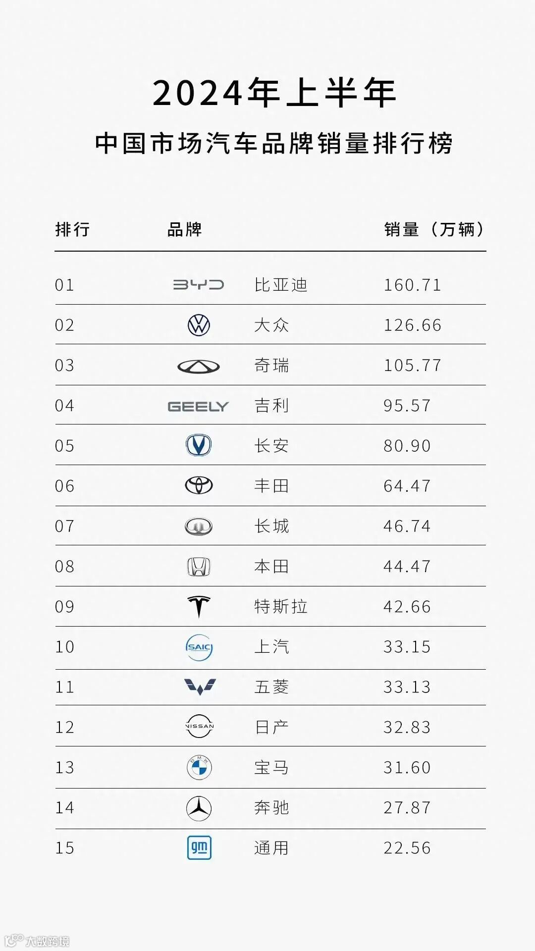 在当前的新能源汽车市场中,中国汽车品牌实力尽显,在刚刚揭晓的2024年上半年中国汽车品牌销量排行榜,2024年上半年比亚迪销售1607145辆,比亚迪位列榜首,大众紧随其后,而在排行榜的前五名中,国产品牌占据了四席,奇瑞、吉利、长安分别位列第三、四、五位。