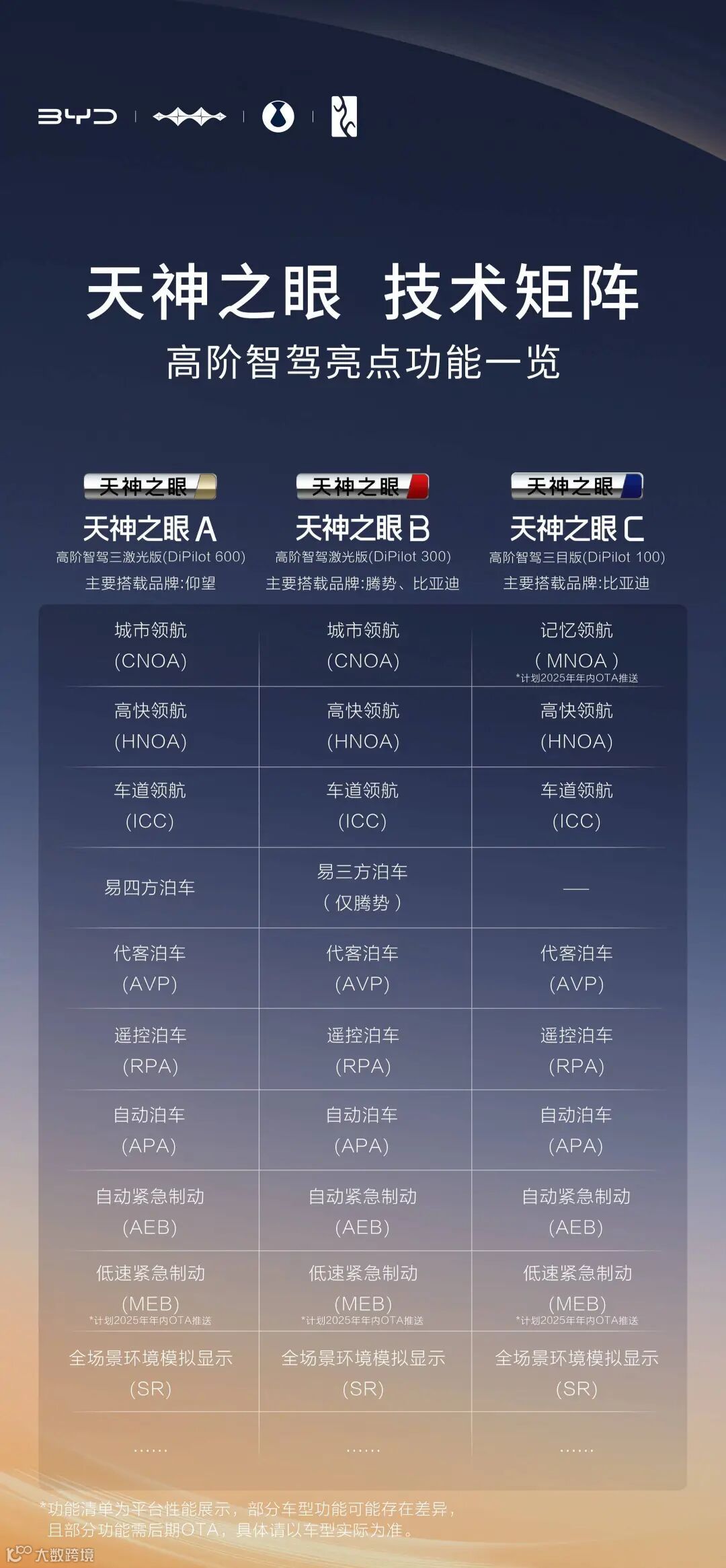 (3)天神之眼C-三目版:以高于行业的标准推动智驾技术普惠,覆盖比亚迪主流车型(7万-20万级),采用前视三目5R12V12U方案,支持高速领航、记忆领航(25年内OTA)、代客泊车等智驾功能,全系“加配不加价”。