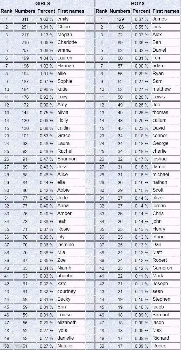 起英文名时,想要“避雷”,最好的办法就是去看看老外都给自家小孩起什么名!以下是老外眼中男/女生英文名的Top 50榜单: