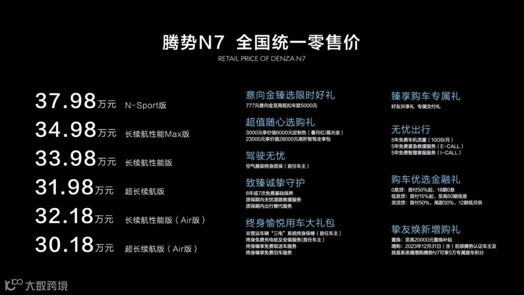 7月3日,腾势N7正式上市。新车有六个版本车型,售价区间为30.18万元-37.98万元。