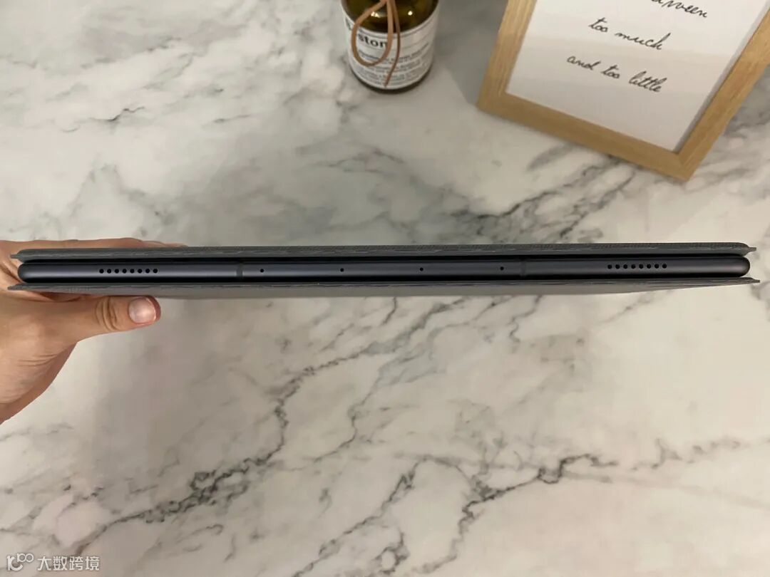 华为MatePad 10.8的键位安排(音量键、锁屏键、充电口、指纹识别模块、耳机口等)都在同一侧,使用起来很方便,符合用户使用习惯。