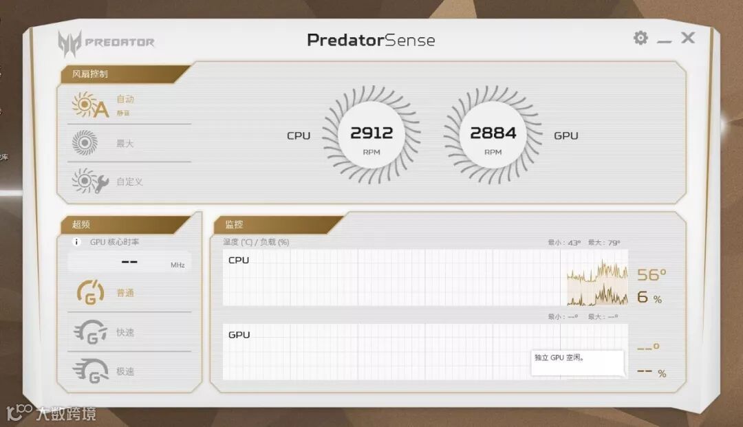 一键开启显卡超频模式,掠夺者控制感应系统PredatorSense,屏幕直观地看到CPU系统温度,并可一键开启CoolBoost风扇增压模式,实时调控高性能游戏散热问题。