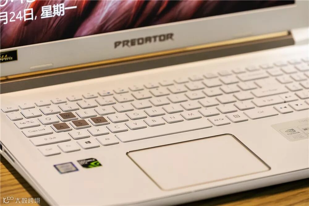 C面由于B面的宽边框,带来更广阔的操作板面,在游戏操作的时候,单只手完全能放上去,小编自己的电脑放上去就有点咯手,时间长的手非常累,相比掠夺者就比较符合人体工程学;细节方面键盘采用的是白色背光灯,WASD键进行单独的金色突出,按键布局设计师稍微做了一点彩蛋,键盘按压回弹灵敏且手感很舒适。