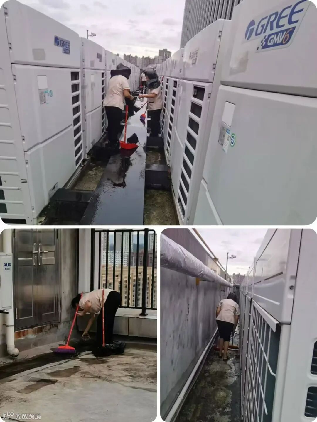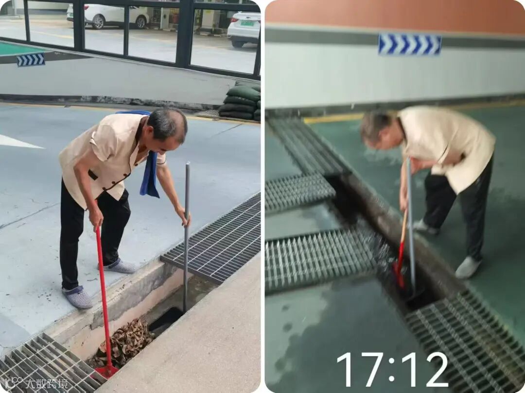 暴雨前,保洁部重点清理大厦排水口、天面淤泥和垃圾,确保排水口无堵塞;
