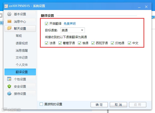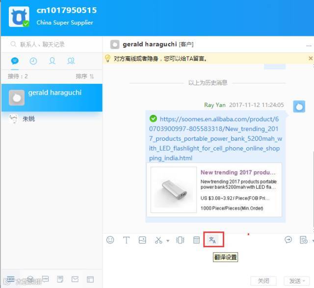 ◆解决小技巧:千牛国际站平台有实时翻译可以免去这个麻烦,在客户聊天界面,点击“翻译设置”,进入设置界面,如下图。