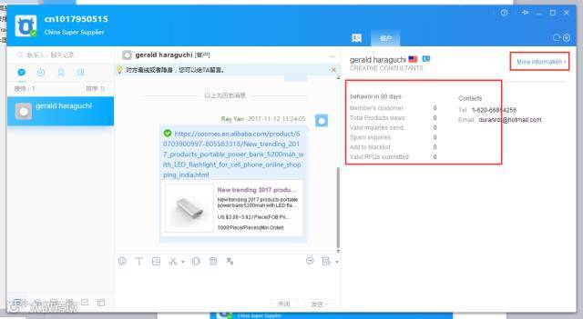 这样就可以一眼看出客户最近90天,有看过多少产品,发过多少询盘等重要信息!当点击“More Information”,可以看到更多客户行为信息。