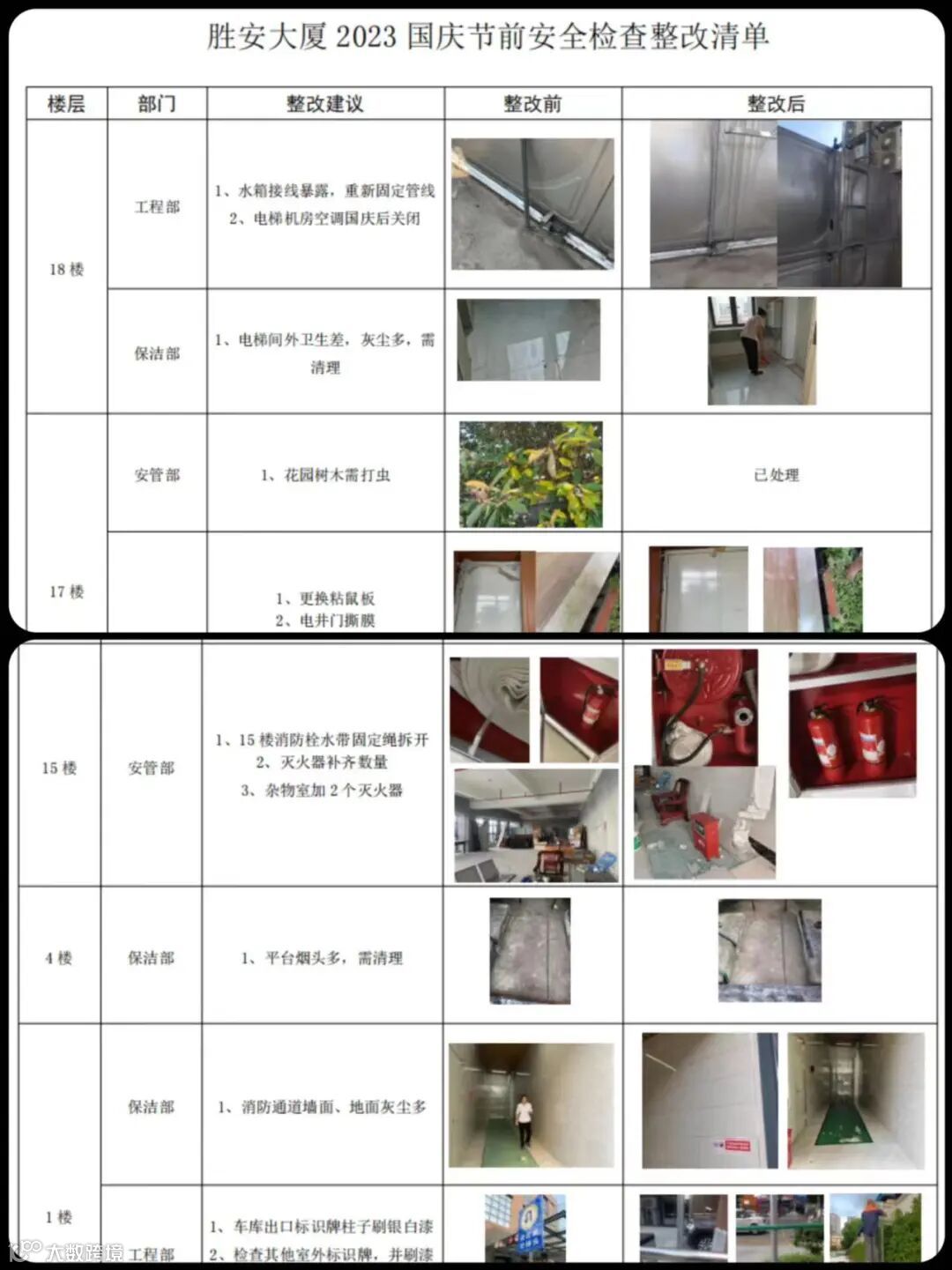 安全重于泰山,在中秋、国庆双节来临前,为扎实做好节假日期间的大厦安全工作,有效预防和遏制安全事故的发生,物业管理处开展了节前安全大检查,着重对大厦消防系统、电梯、水泵房、监控系统 、办公区域、外围公共区域等进行排查。排除大厦内存在的不安全、不稳定因素,对检查中发现的安全隐患及时整改。