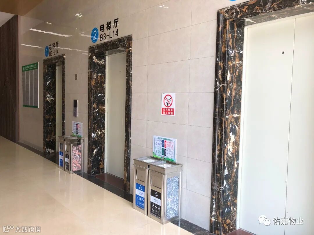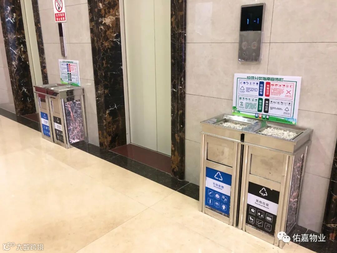 各楼层电梯口均放置可回收垃圾桶与其他垃圾桶,并设置了垃圾分类指南宣传栏,向大家进一步讲解垃圾分类的知识,以便大家正确投放垃圾。