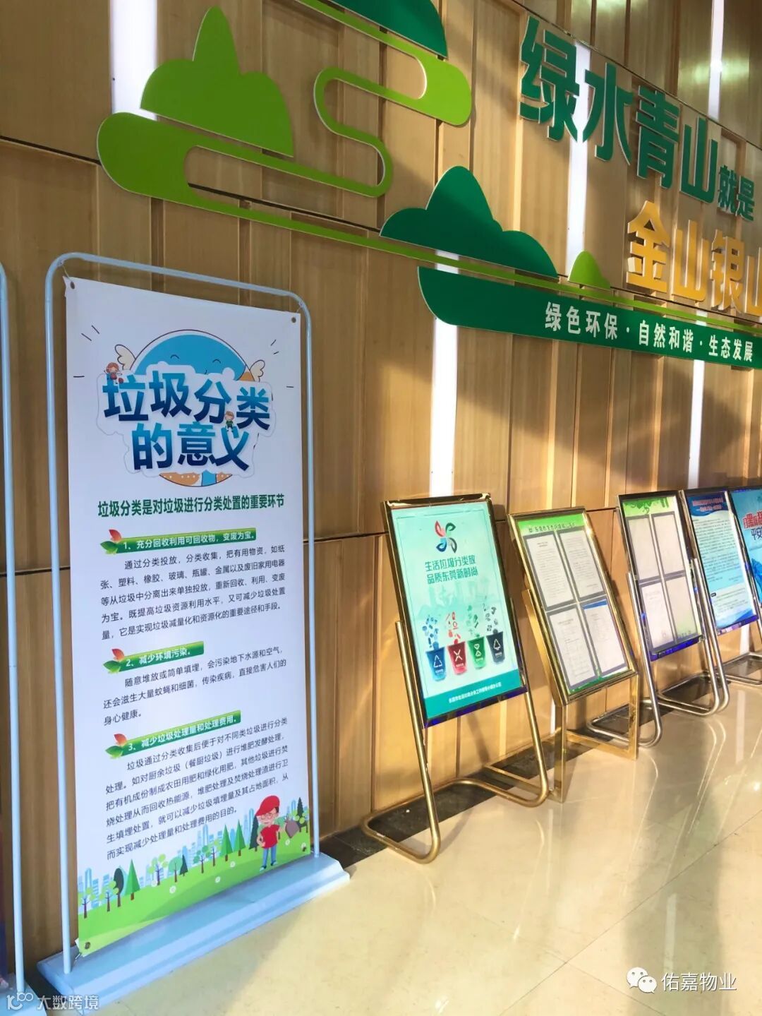 ——大厦大堂摆放着垃圾分类的宣传栏