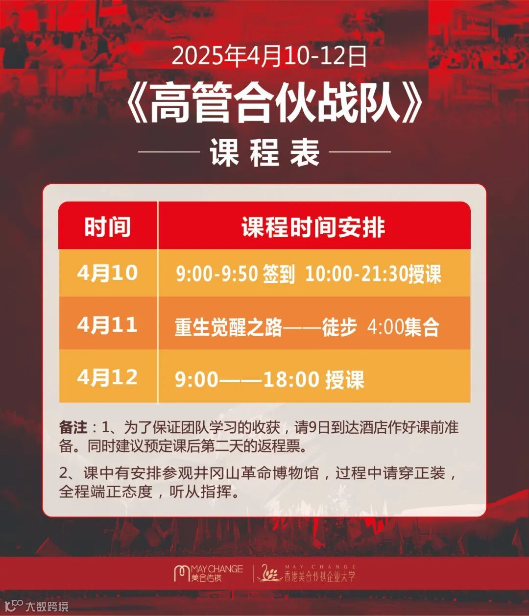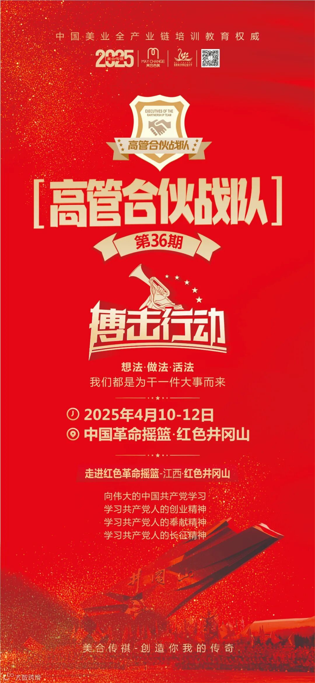 来自全国各地亲爱的企业家和美业精英们,欢迎走进美合传祺第36期中国美业《高管合伙战队》的课堂。在即将到来的4月10-12日,我们共同在中国革命圣地井冈山,为了我们的企业、为了我们的团队,为了我们的目标与信念,一起接受革命先烈信念的洗礼,在红色文化的熏陶中重铸,或加强我们企业人追逐目标与梦想的信仰与信念。为了尽最大可能获取收获,美合传祺会务组特编辑本文,作为课前学习的提示,请所有参加课程的企业与个人,务必认真阅读,以便获得更好的学习指引。