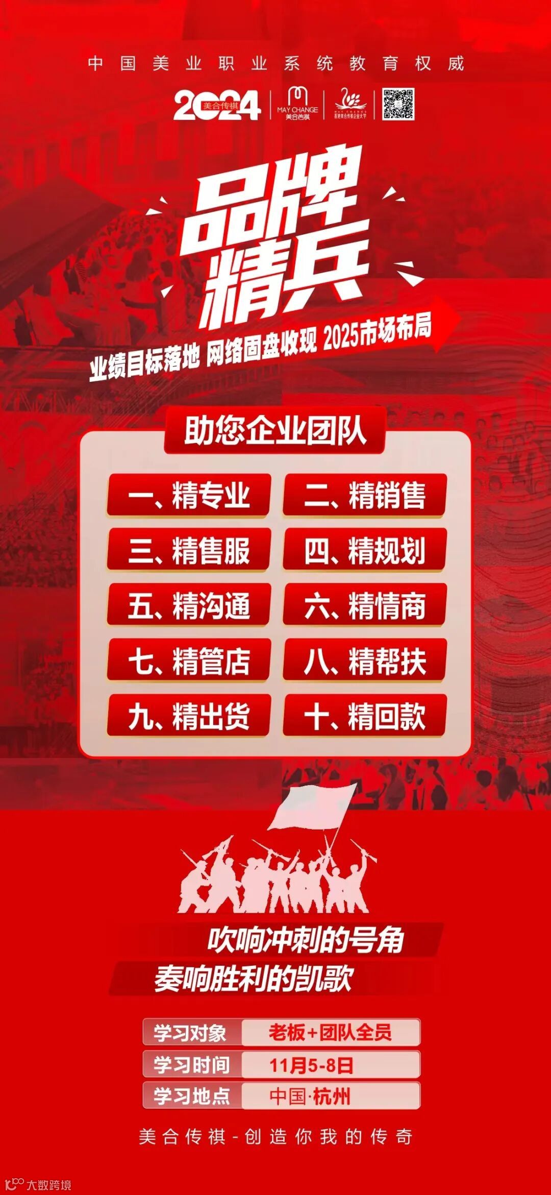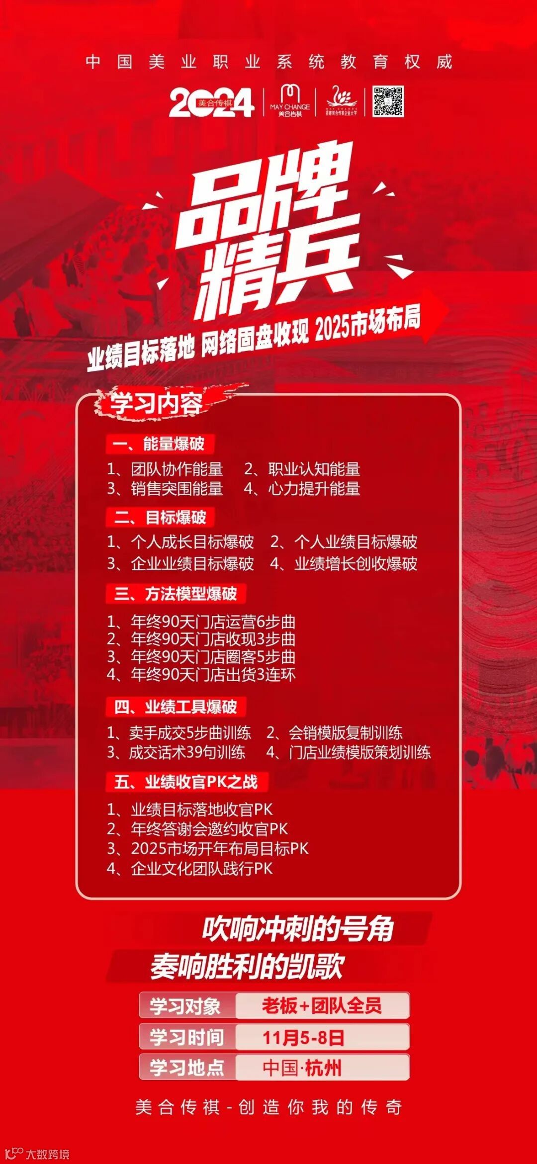 你们好!欢迎您参加美合传祺开年内训:《品牌精兵业绩收官之战》,美合传祺全体美合传祺人感谢您对本课程的关注和大力支持,并热烈欢迎您的到来。在2024年11月5-8日这4天3夜的时间里,我们将会与大家共同探讨,共同成长,透过学习,成为一名美业全能型人才。为此,我们会务组也会以最高的服务品质让同学们轻松、快乐的享受学习旅程。美合传祺全体人员祝您学习愉快!