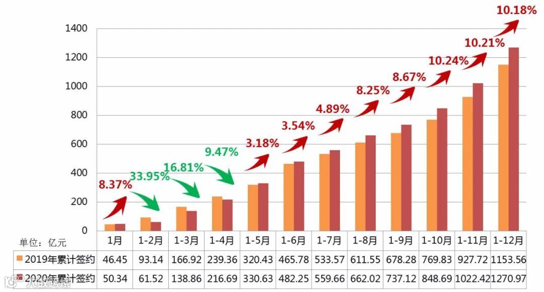 2020年1-12月,公司累计实现签约面积1,174.45万平方米,同比增长6.96%;累计签约金额1,270.97亿元,同比增长10.18%,超额完成了年初制定的1,210亿元的销售目标,年度计划完成率达105%!