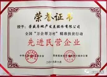 因按照河北省“千企帮千村”精准扶贫任务要求,在产业扶贫、教育扶贫等方面做出的重要贡献,荣盛发展荣获2019年“全国万企帮万村精准扶贫行动先进民营企业”称号。