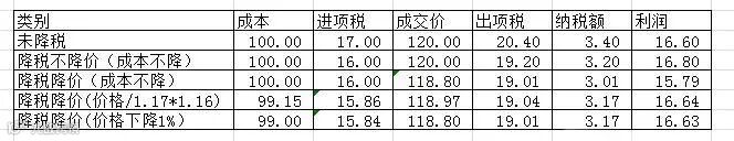 同样都是下降1%的情况,你的成本为100*0.99=99元,你的成交价为120*0.99=118.8元,进项税为99*0.16=15.84元,出项税为118.8*0.16=19.01元,利润为118.8-99-(19.01-15.84)=16.63元。