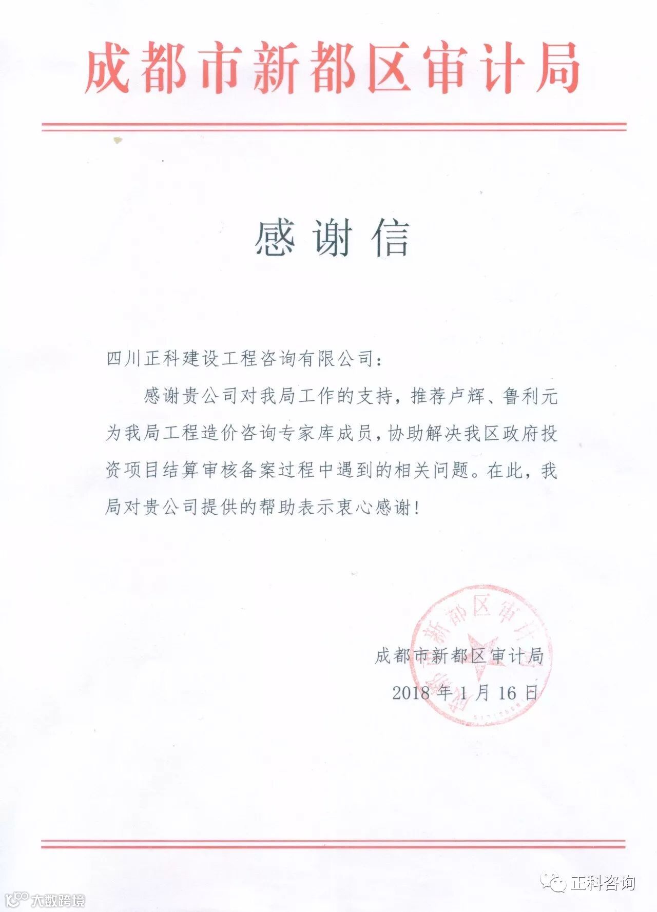 1月16日,新都区审计局特地向正科公司发来感谢信,推荐我公司卢辉、鲁利元为新都区审计局工程造价咨询专家库成员,协助解决区政府投资项目结算审核备案过程中遇到的问题。