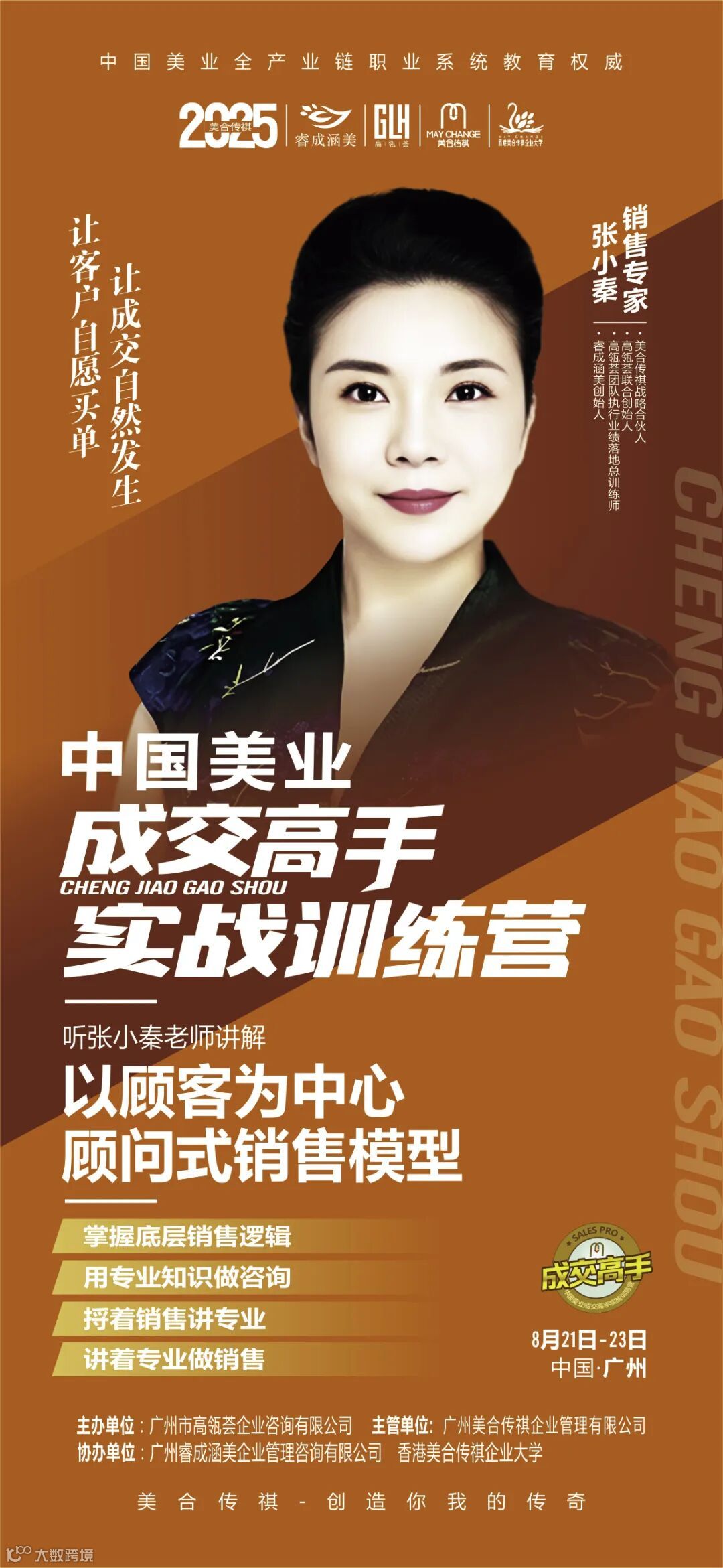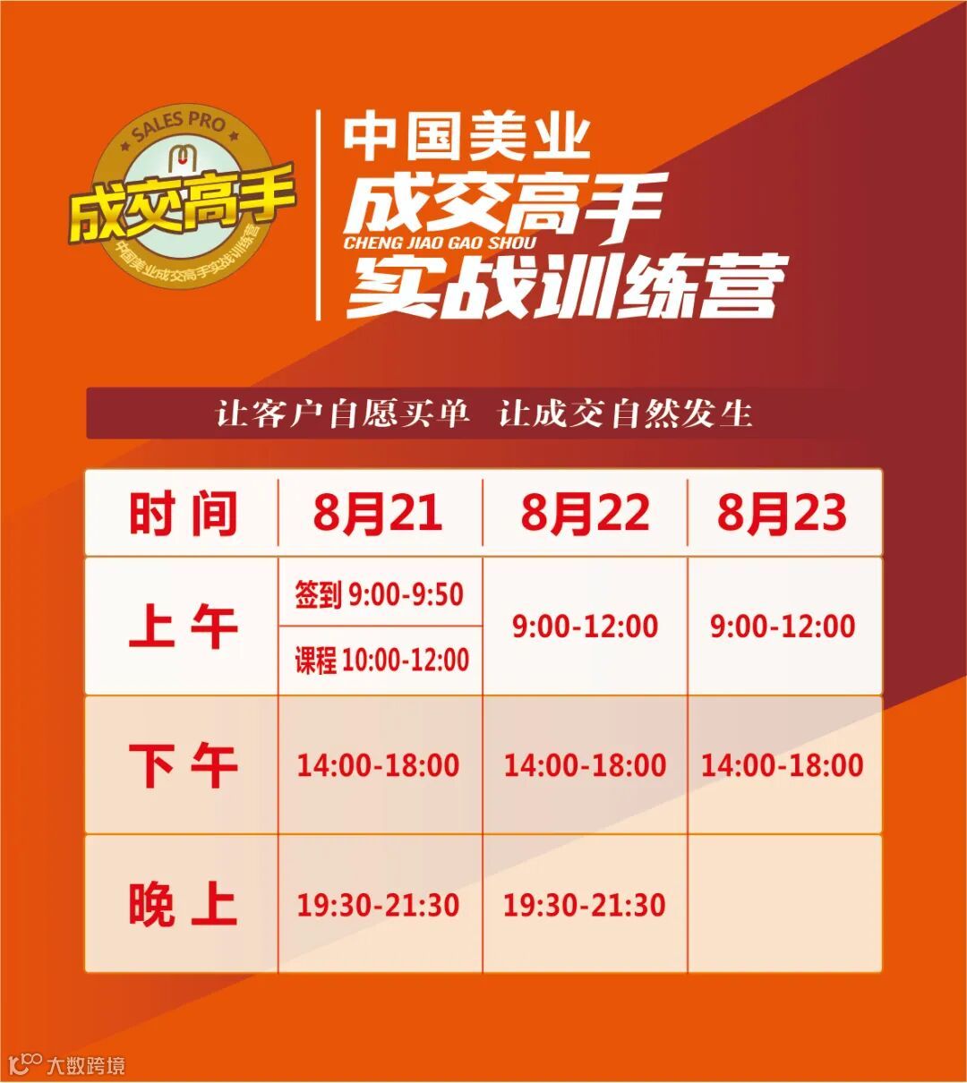 你们好!欢迎您参加美合传祺《成交高手实战训练营》课程,美合传祺全体人员感谢您对本课程的关注和大力支持,并热烈欢迎您的到来。在2025年8月21-23日这3天2夜的时间里,我们将会与大家共同探讨、共同成长,透过学习,成为一名可以驾驭千万业绩的操盘手。为此,我们会务组也会以最高的服务品质让同学们轻松、快乐的享受学习旅程。美合传祺全体人员祝您学习愉快!