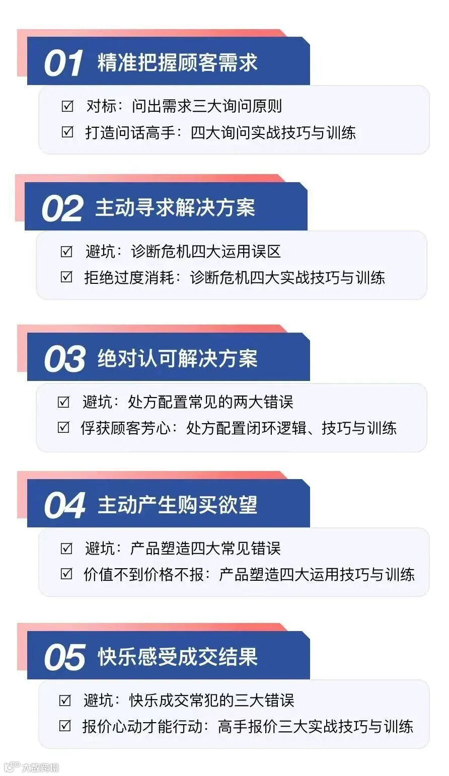 一套以顾客为中心的标准化流程,从开场破冰到需求挖掘,从方案呈现到促成签单,每一步都有可复制的话术和动作—— 新手学完就能用,老手学完能精进。