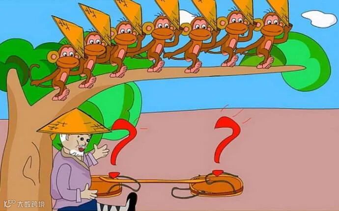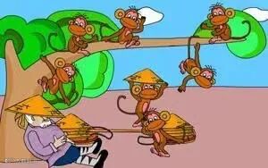 有办法了!他赶紧把头上的帽子拿下来,丢在地上。猴子们也学他,纷将帽子扔在地上。卖帽子的人高高兴兴地捡起帽子,回家去了。回家之后,他得意洋洋地将这件有趣的事讲给了他的儿子和孙子。